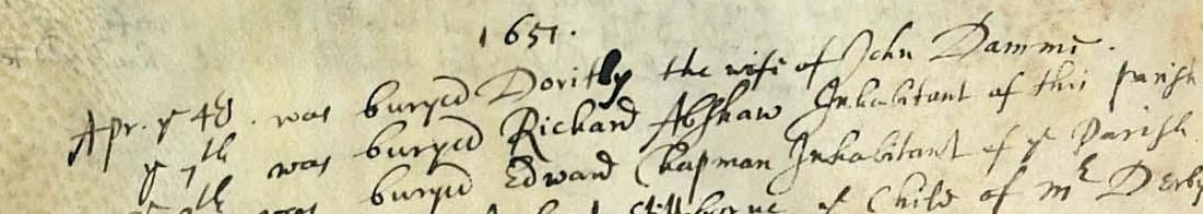 I was not able to find a record of Richard’s birth in the Stifford Register, which started about 20 years before his recorded birth date. I was, however, able to find the record of his death on April 7, 1651, not 1635.